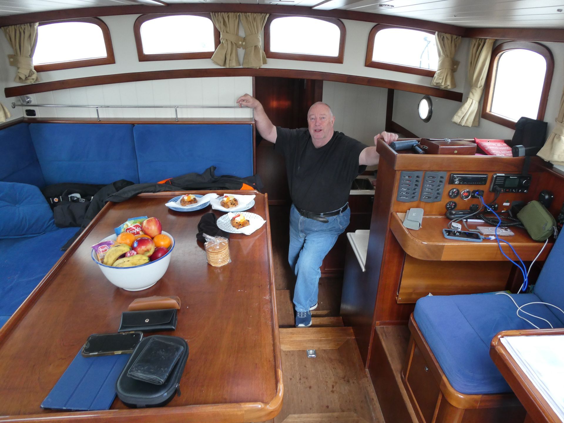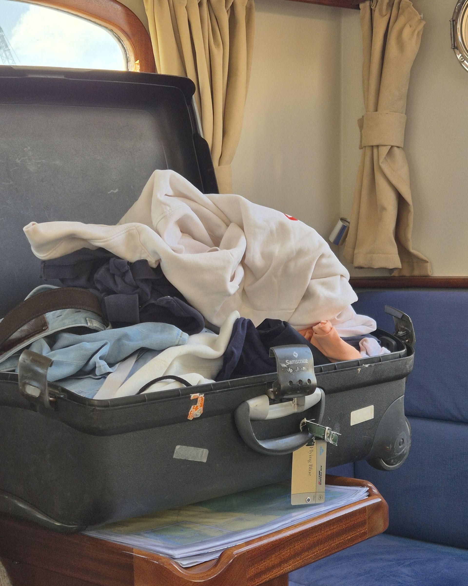 De ruimte aan boord van alle zeiljachten is beperkt en de riante koffer van ons 4e bemanningslid is uitgestald op de navigatie tafel. Daar moet nog even een plekje voor gevonden worden.
