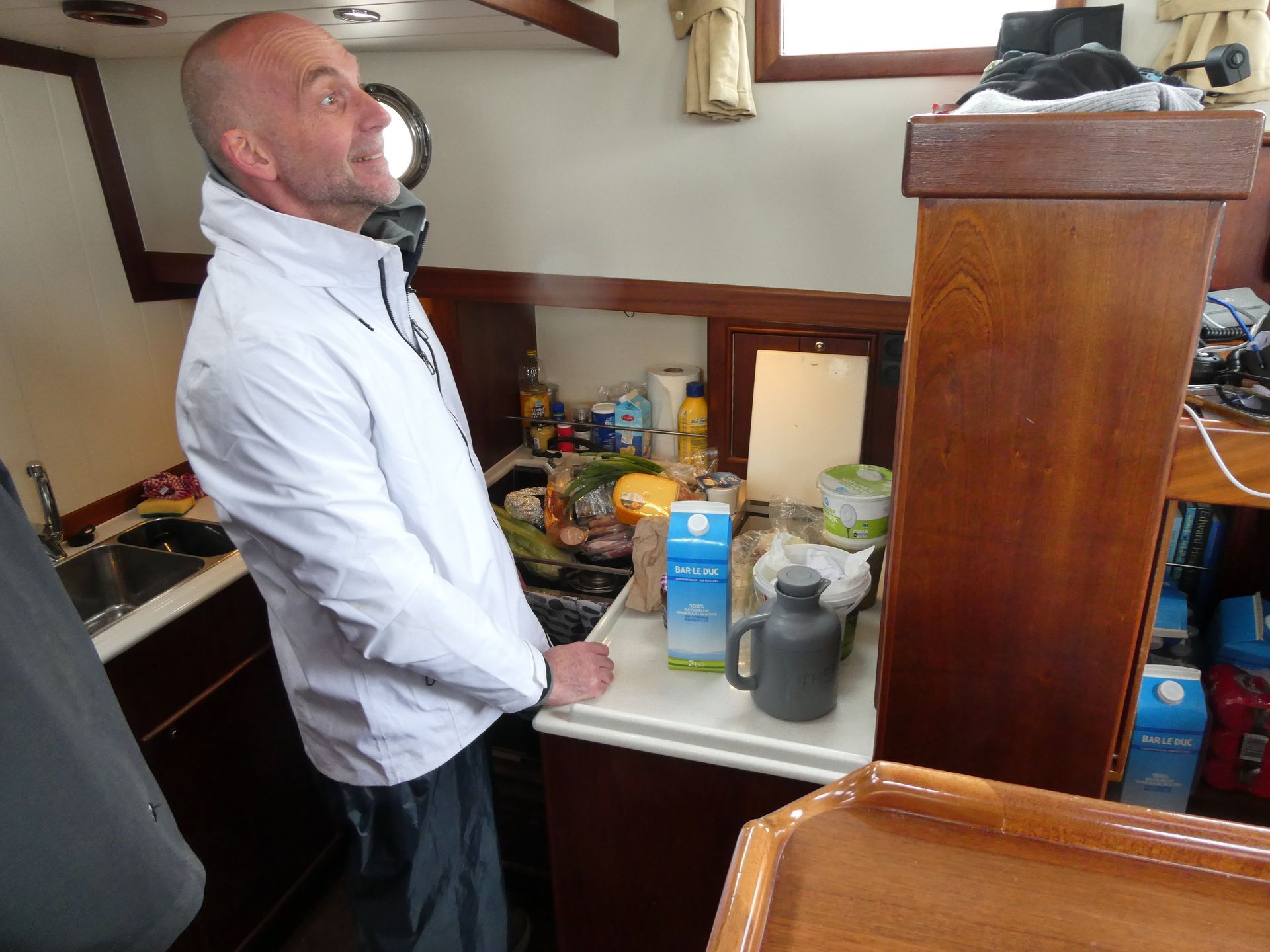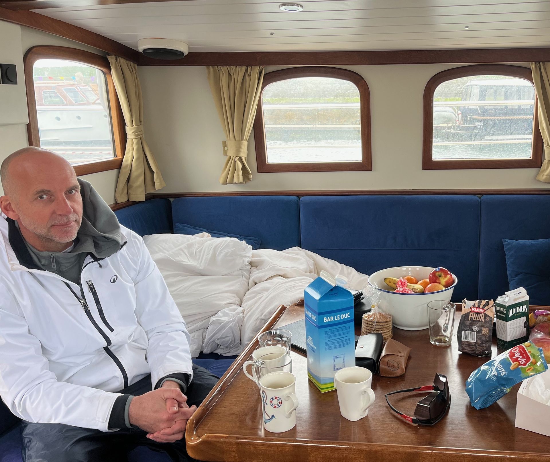 07.40 uur wakker en alert naar de kombuis (0,75 meter naast mijn bed).