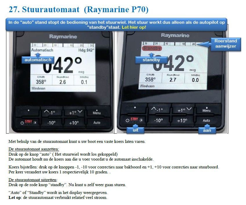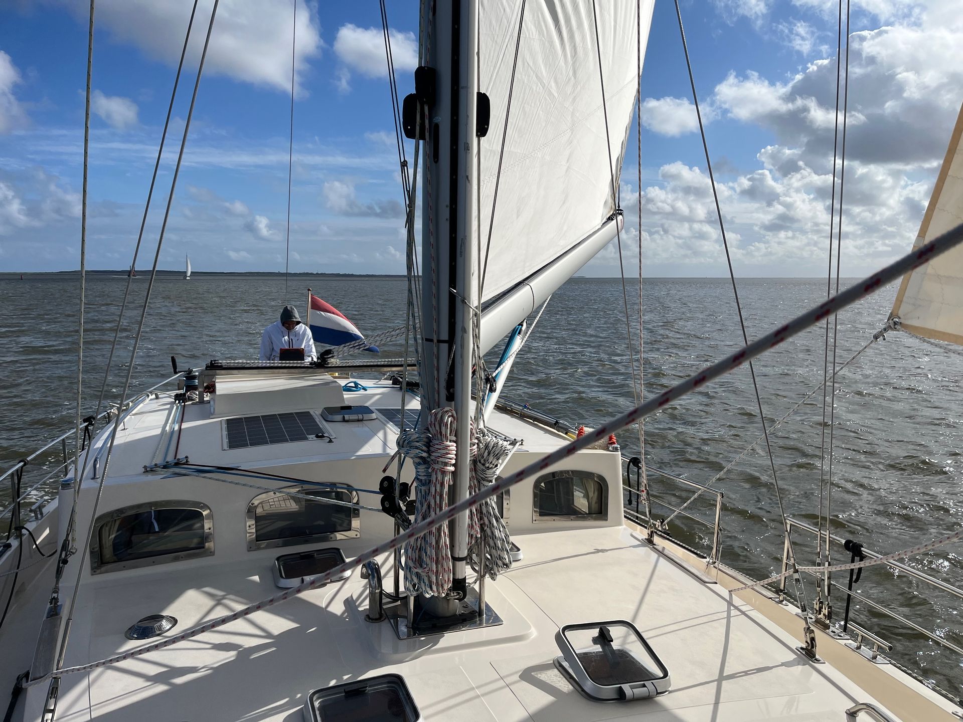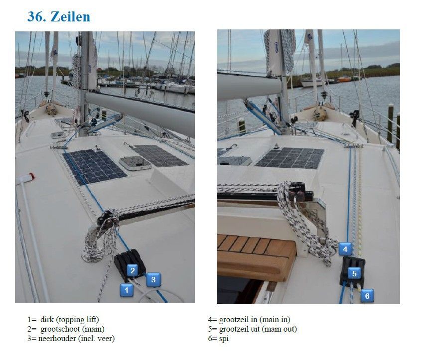 Om 09.50 uur de eerste lessen hoe de zeilen te hijsen op dit jacht en de werking van de stuurautomaat. Eitje.