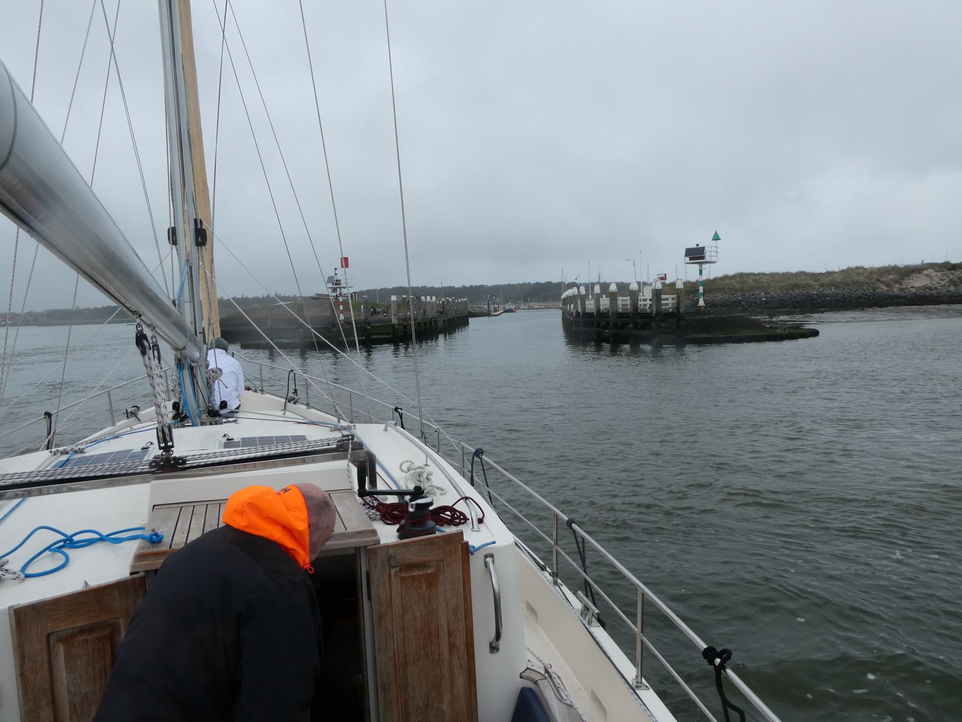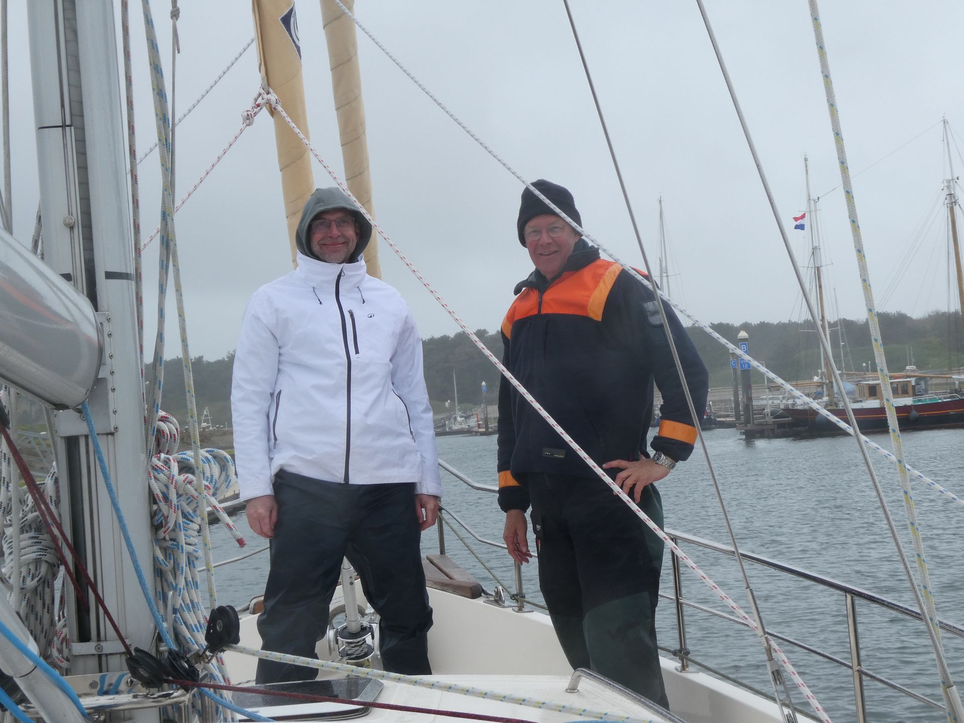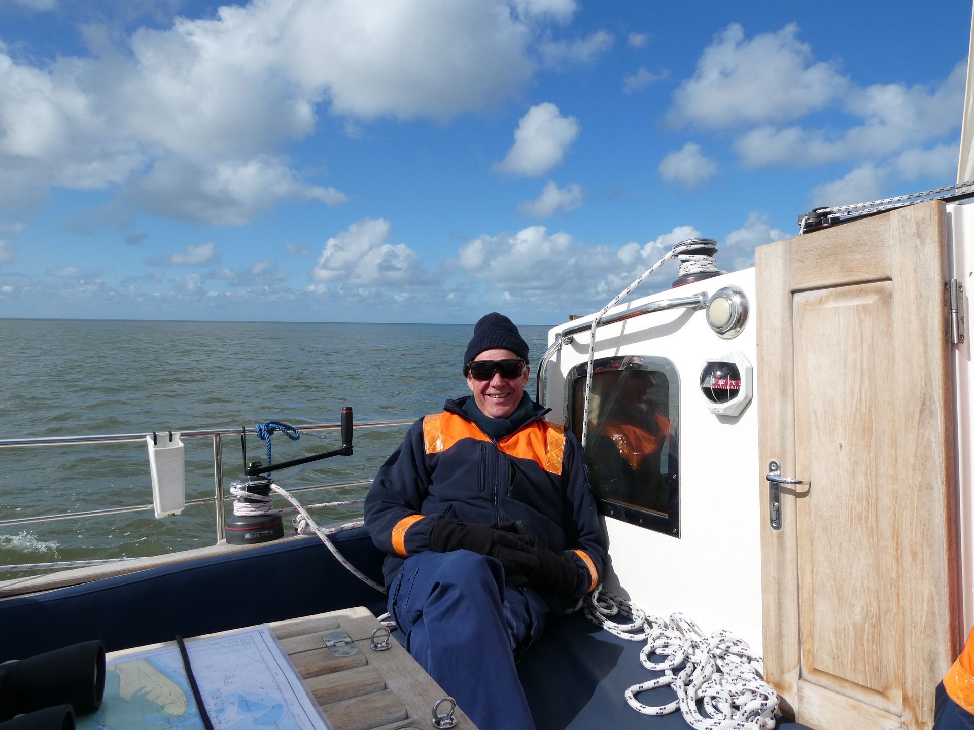 RvdW, die in zijn CV bij de sollicitatie procedure om lid te mogen worden van dit elite zeilschip heeft aangegeven over ruime zeilervaring te beschikken, blijkt in zijn jonge jaren op een BM te hebben gezeild (Een BM of Bergumermeer is een zwaardzeilboot met een zeiloppervlakte van 12 m².) Dat levert natuurlijk een prima basis voor “zeilen”, maar de zeil handelingen aan boord van dit 13 meter lange zeewaardige zeiljacht zijn van een andere categorie. Gelukkig is RvdW een snelle en leergierige zeiler, die de aanwijzingen van PS en KS (dat BM geeft beste een goede basis..) snel opneemt en ook uitvoert. Als je als gezagvoerder van een baggerschip 50 specialisten in bedwang kan houden, neem ik aan dat je aanwijzingen van 2 zeilende ex-loodsen gemakkelijk absorbeert. Top!