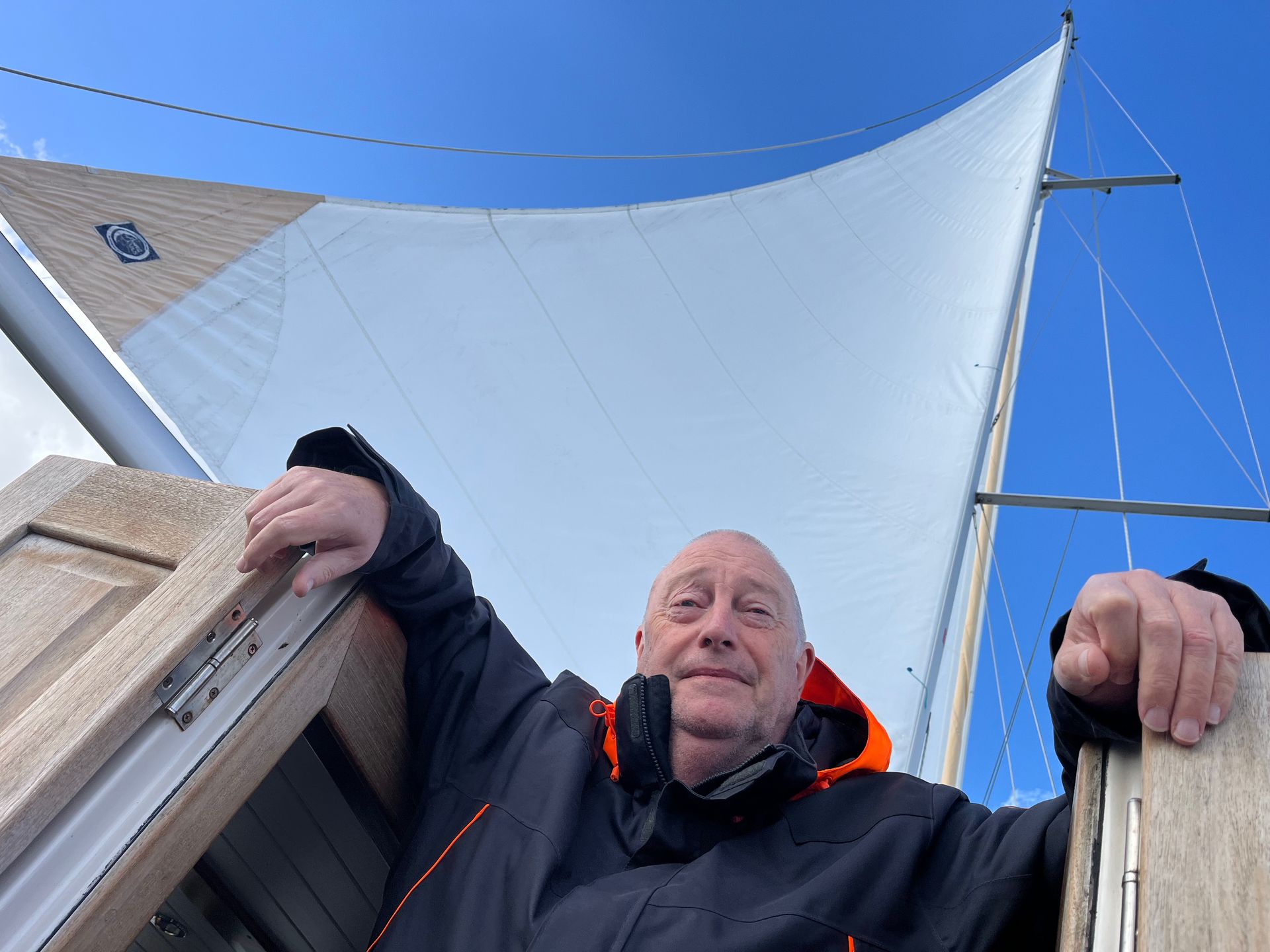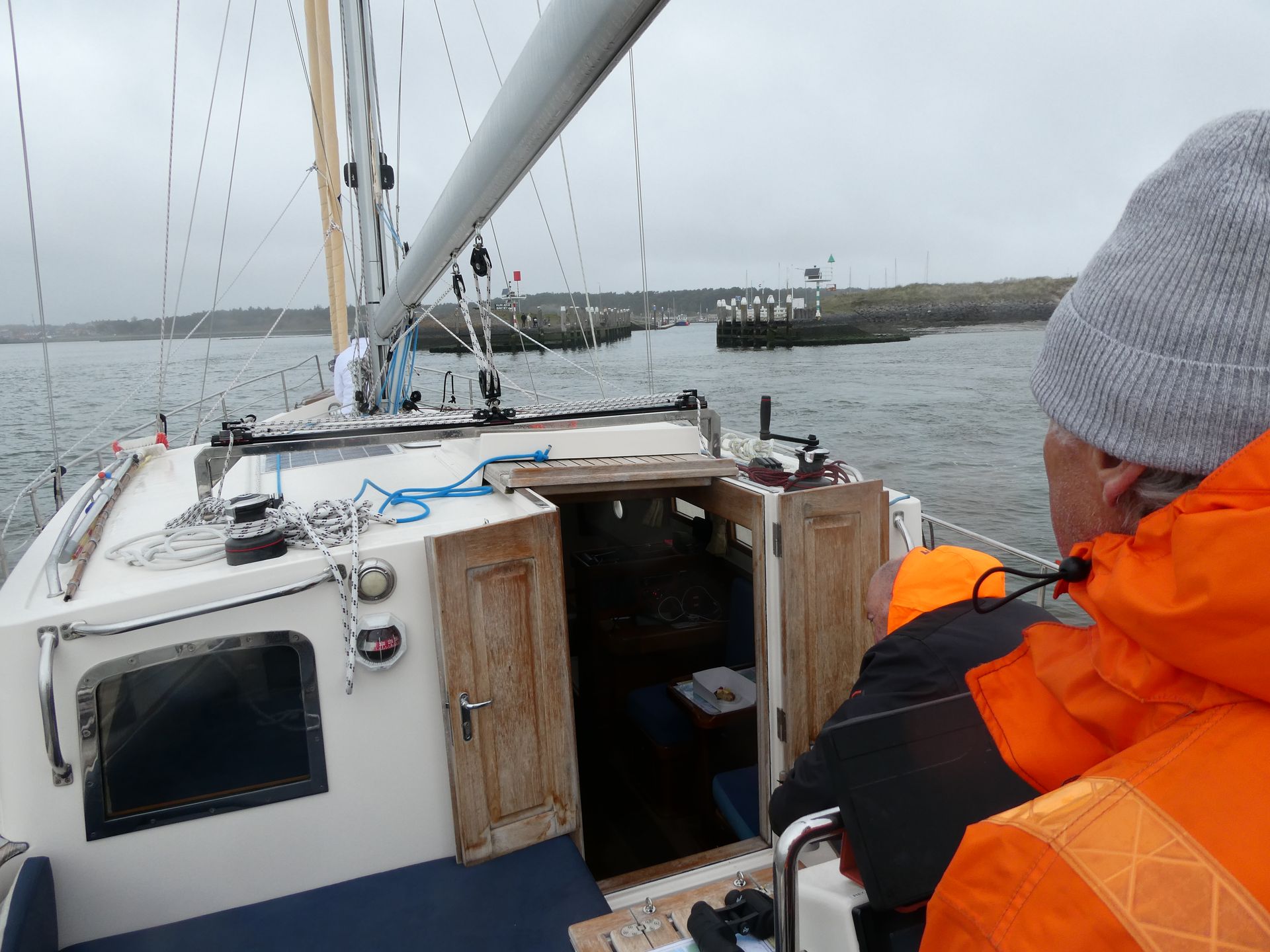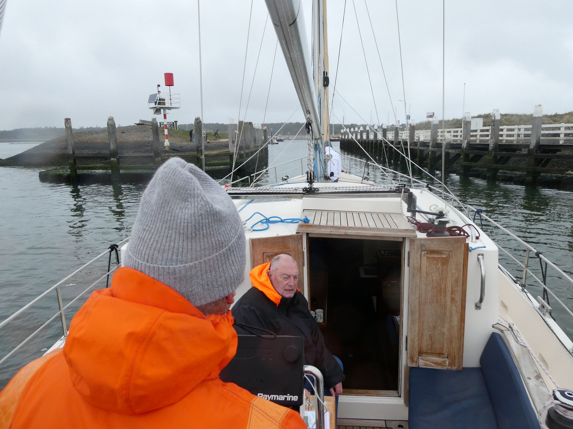RvdW, die in zijn CV bij de sollicitatie procedure om lid te mogen worden van dit elite zeilschip heeft aangegeven over ruime zeilervaring te beschikken, blijkt in zijn jonge jaren op een BM te hebben gezeild (Een BM of Bergumermeer is een zwaardzeilboot met een zeiloppervlakte van 12 m².) Dat levert natuurlijk een prima basis voor “zeilen”, maar de zeil handelingen aan boord van dit 13 meter lange zeewaardige zeiljacht zijn van een andere categorie. Gelukkig is RvdW een snelle en leergierige zeiler, die de aanwijzingen van PS en KS (dat BM geeft beste een goede basis..) snel opneemt en ook uitvoert. Als je als gezagvoerder van een baggerschip 50 specialisten in bedwang kan houden, neem ik aan dat je aanwijzingen van 2 zeilende ex-loodsen gemakkelijk absorbeert. Top!