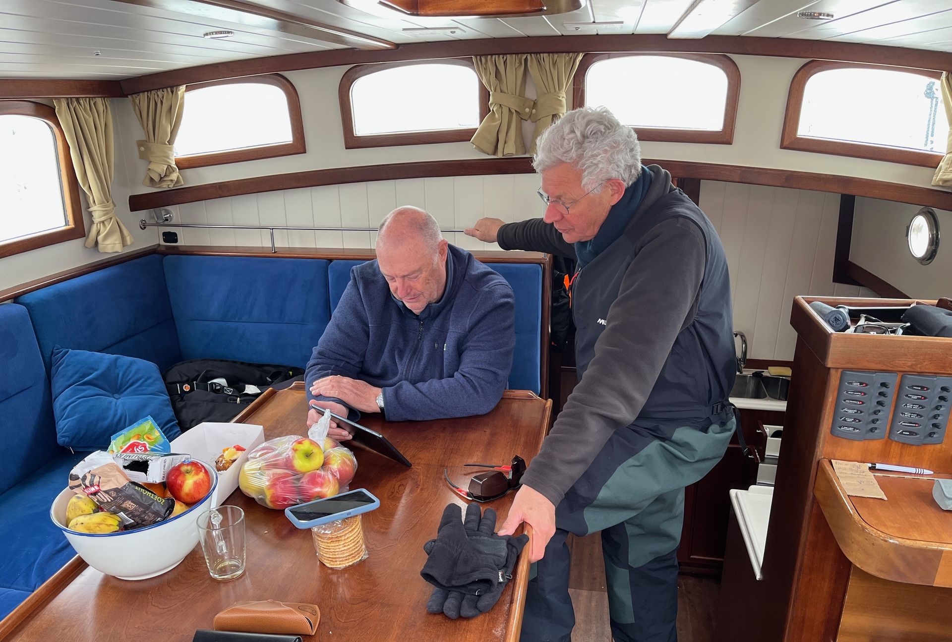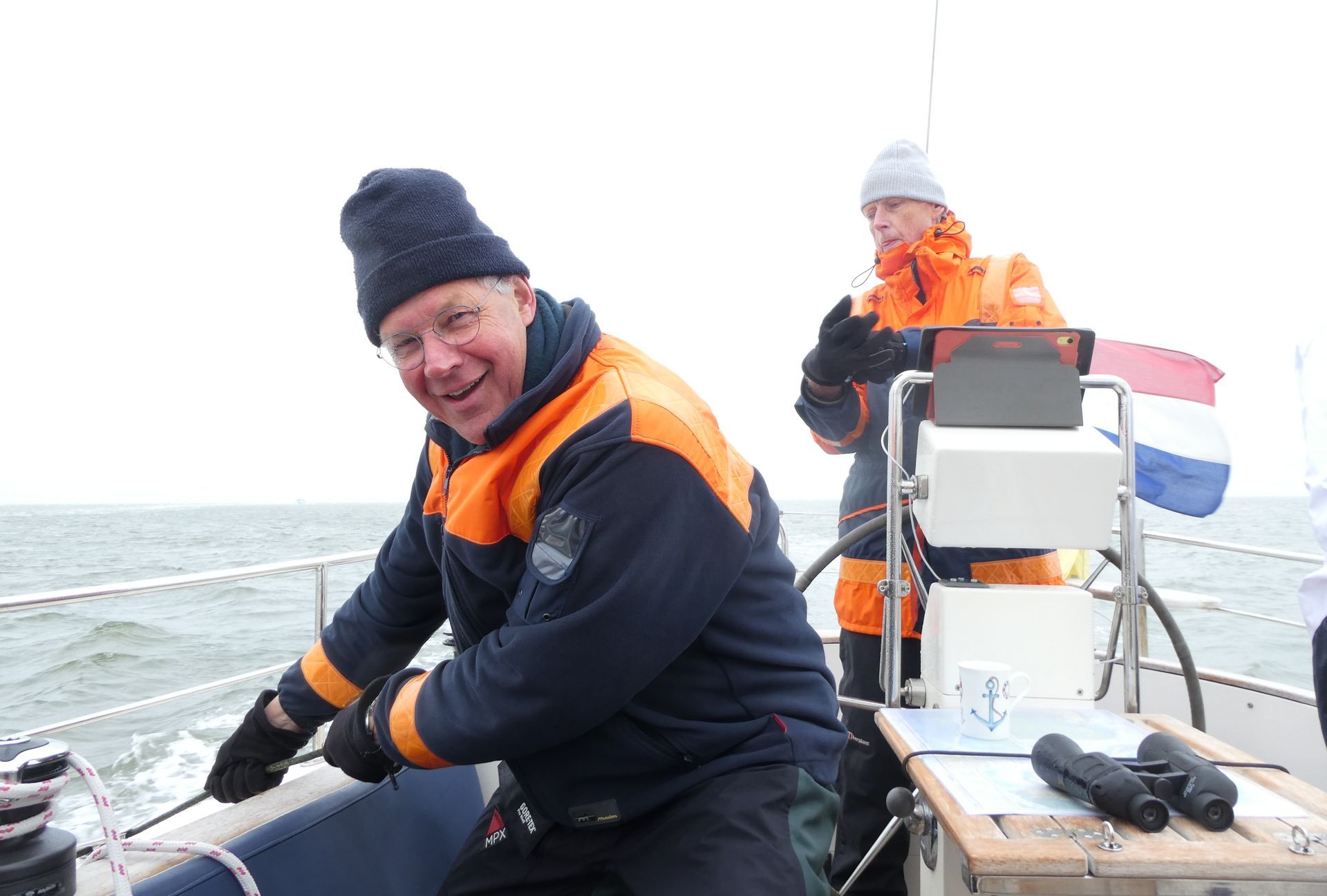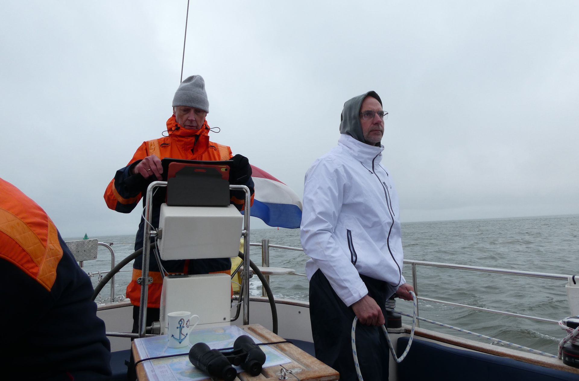 Het wordt steeds frisser en we zijn om beurten in de kajuit om weer een beetje op te warmen. Mijn rol aan boord is in dit geval een voordeel, er is altijd wel water op te zetten of schoon te maken, of iets te bereiden in de warme kombuis.
