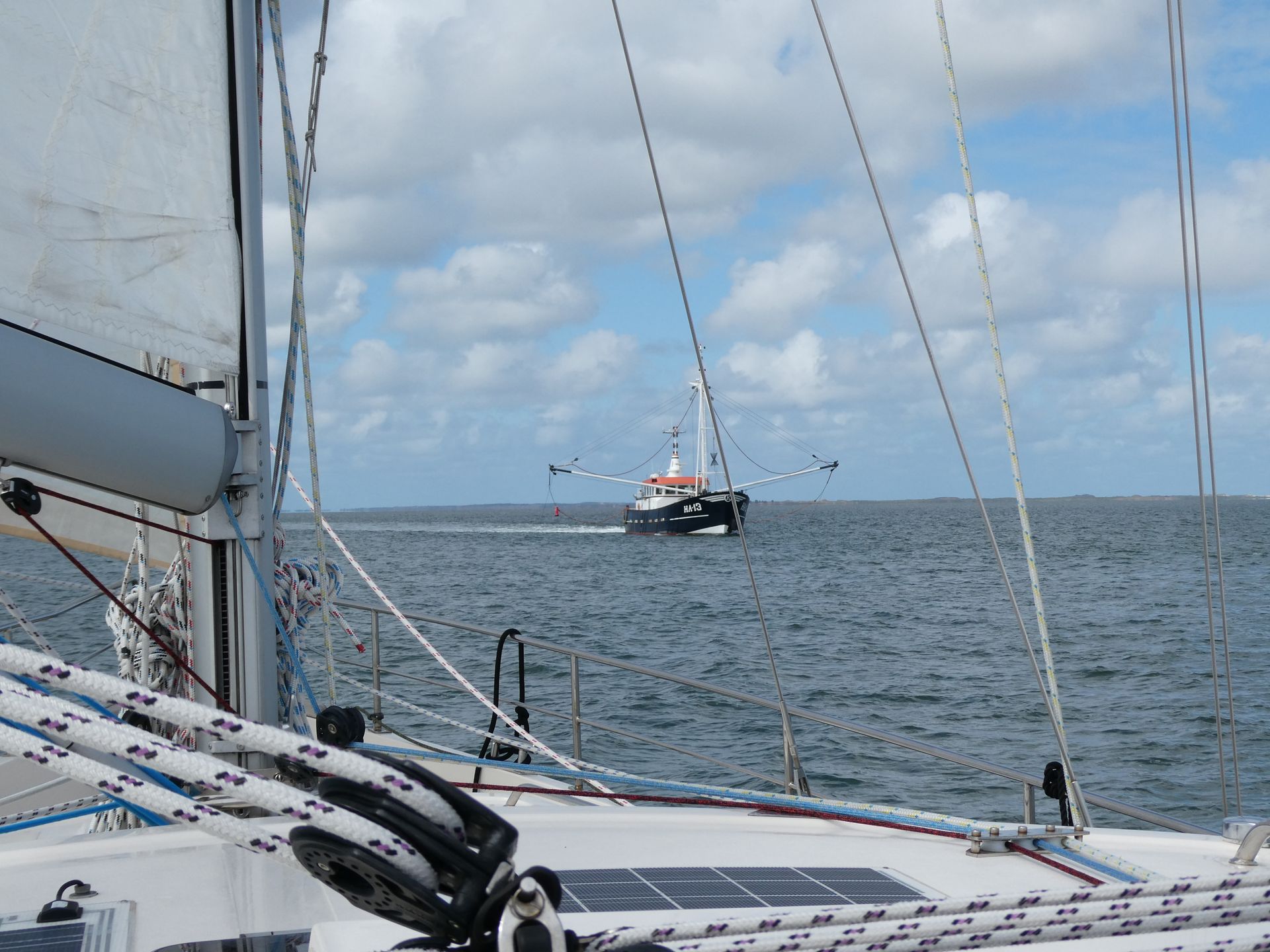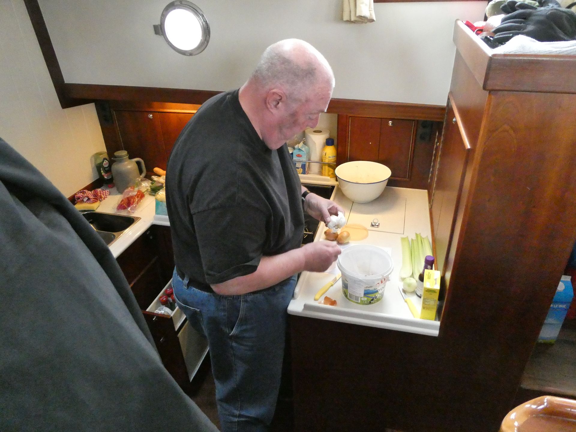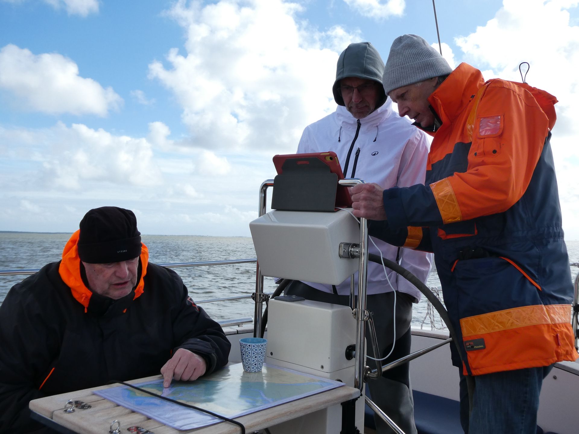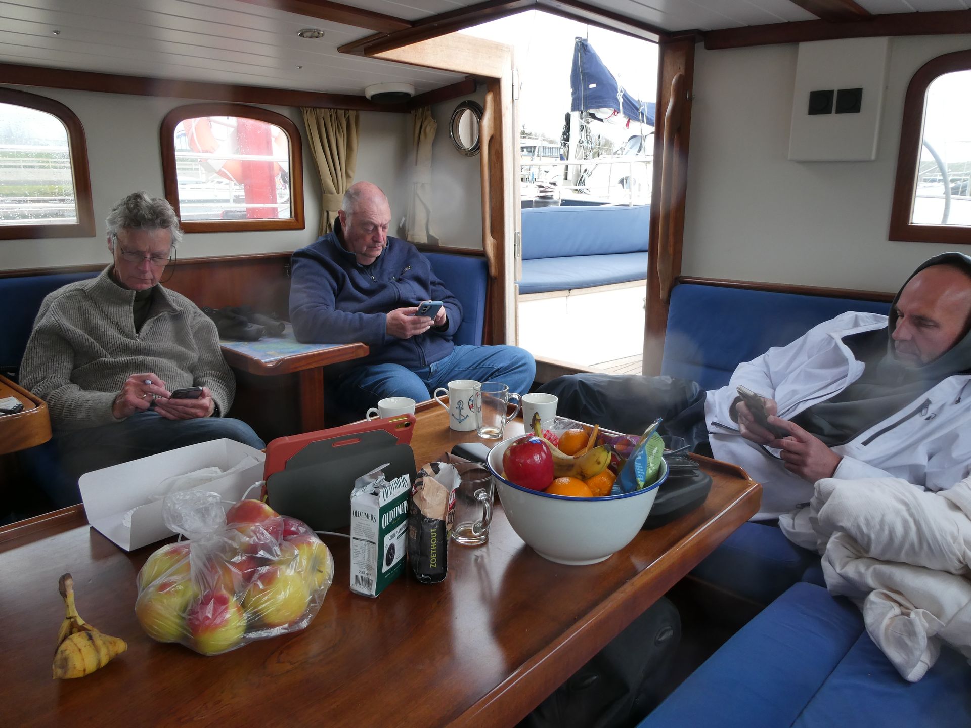 Het wordt steeds frisser en we zijn om beurten in de kajuit om weer een beetje op te warmen. Mijn rol aan boord is in dit geval een voordeel, er is altijd wel water op te zetten of schoon te maken, of iets te bereiden in de warme kombuis.