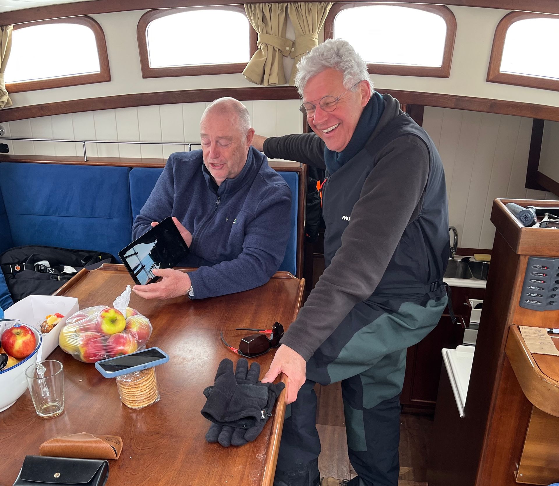 Ik kijk na de lunch met KS naar een door hem toegestuurde film over zijn laatste loodsreis. Op de tablet in de kajuit.